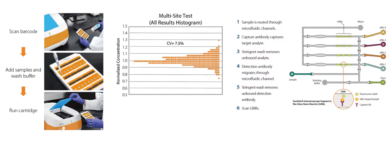 90분 이내에 재현성이 높은 검증된 분석 데이터와 수동 작업 없이 일관된 바이오마커 검출 결과를 얻음 - 피코그램 미만의 민감도, 4로그 이상의 동적 범위, 그리고 최고의 실험실 자동화에 필적하는 정밀도를 제공